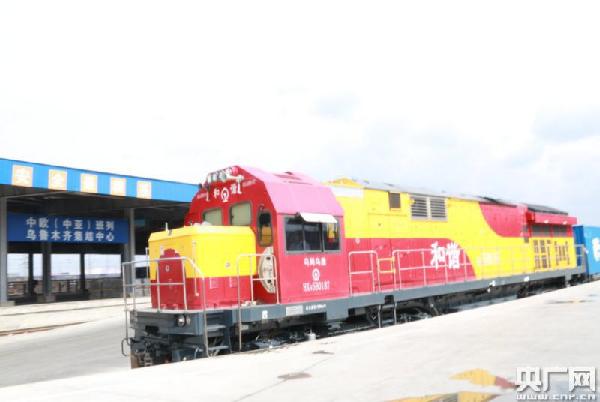 北京时间下午4时,一辆载满钢材的列车中欧(中亚)班列乌鲁木齐集结中心准点出发。(央广网记者 王雨馨 摄)