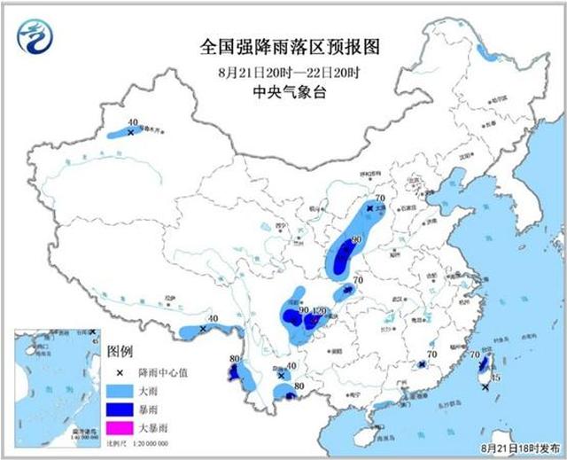 预计8月21日20时至22日20时,黑龙江北部、山西西部、陕西大部、甘肃东部、四川盆地东北部和南部、云南中南部、江西南部、广东西南部沿海、西藏东南部、新疆沿天山一带、台湾岛西部和南部等地的部分地区有大到暴雨,局地大暴雨(100~120毫米);上述部分地区伴有短时强降水(小时雨量20~50毫米,最大可达60毫米以上),局地有雷暴大风等强对流天气。
