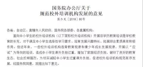 近日,国务院办公厅印发了《关于规范校外培训机构发展的意见》(以下简称《意见》),针对当前校外培训机构存在的有安全隐患、证照不全、超前培训、超标培训等突出问题,从规范校外培训机构的关键环节入手提出了一系列措施。