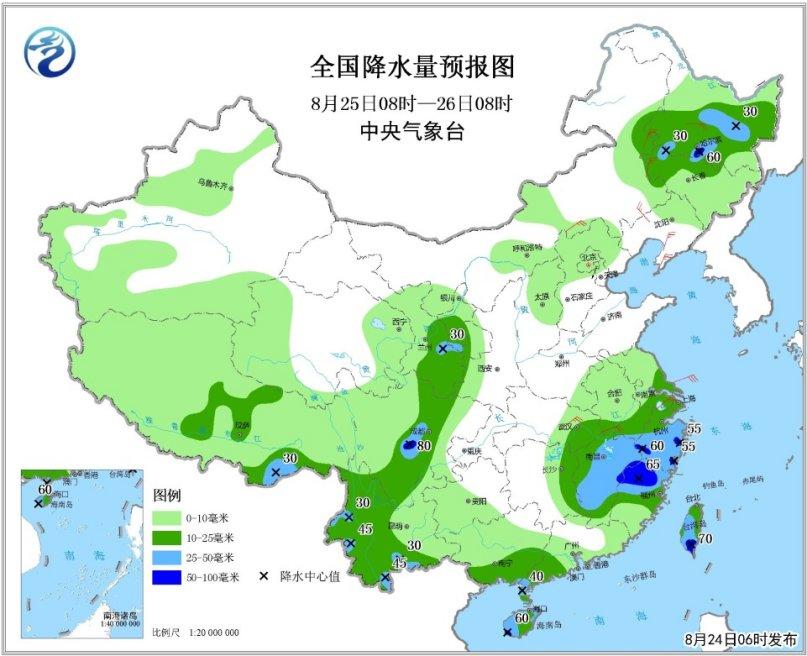 8月25日08时至26日08时,黑龙江中南部、吉林西北部、西北地区东部、四川盆地西部、云南中西部、江淮东部、江南中东部、华南南部以及台湾岛等地的部分地区有中到大雨,其中,黑龙江南部、吉林北部、四川盆地西南部、浙江南部、福建北部以及台湾岛南部等地局地有暴雨(50~70毫米),东北地区西部和南部、内蒙古东部、黄淮东部、江汉东部等地有4~6级风。