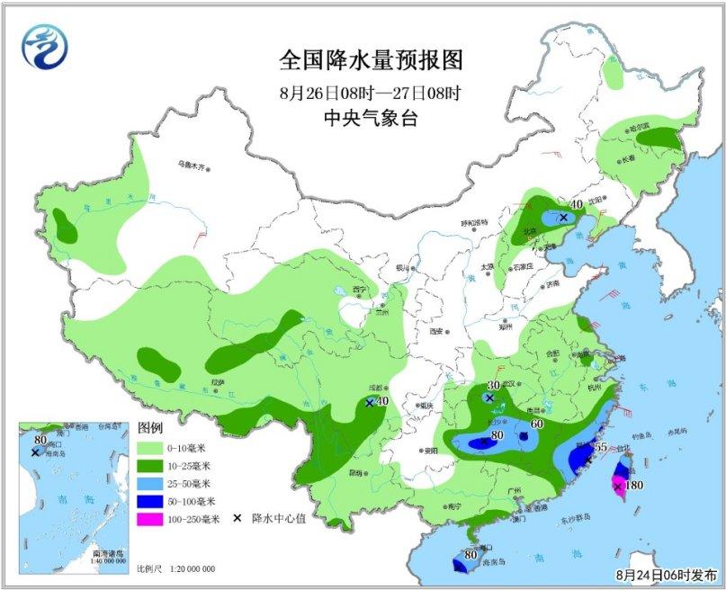 8月26日08时至27日08时,黑龙江东南部、辽宁西南部、华北东北部、四川盆地西南部、云南西北部、江汉南部、江南大部、华南南部、海南岛以及台湾岛等地部分地区有中到大雨,其中湖南南部、江西西南部、福建东部、海南岛西南部以及台湾岛等地局地有暴雨或大暴雨(100~180毫米),内蒙古东部、东北地区南部、山东半岛、江淮东部、江汉、江南东部等地有4~6级风。台湾海峡、南海东北部海域将有6~8级、阵风9级的风。