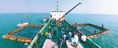 在莱州湾海洋牧场,海上网箱养殖以保护生物多样性为前提,有序进行。