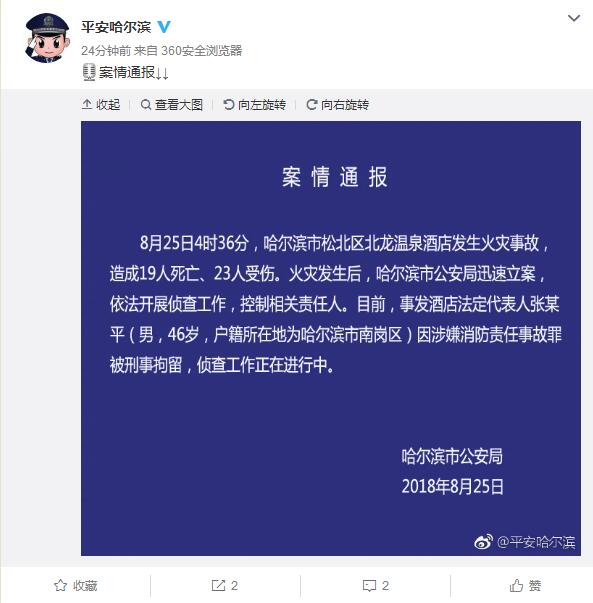 中新网8月25日电 黑龙江省哈尔滨市公安局官方微博“平安哈尔滨”通报:8月25日4时36分,哈尔滨市松北区北龙温泉酒店发生火灾事故,造成19人死亡、23人受伤。