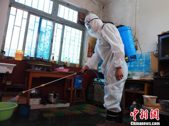 8月25日,工作人员正在对受灾居民家进行消杀工作。 沙见龙 摄