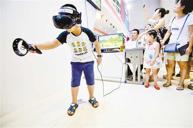 8月25日,智博会重庆区县园区馆九龙坡展区,小朋友正在体验MR(虚拟现实混合技术)。