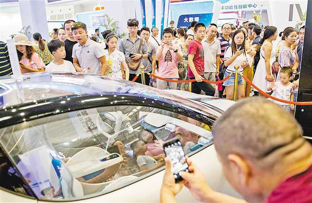 智博会重庆区县园区馆巴南展区,无人驾驶车引来众多市民关注。