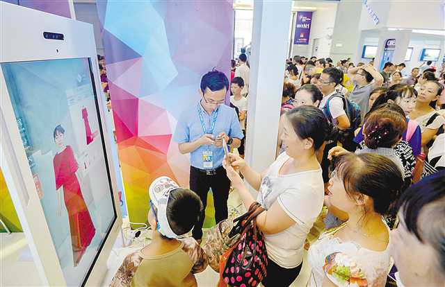 智博会重庆区县园区馆,市民通过手机试衣APP“试穿”各式“新衣”。