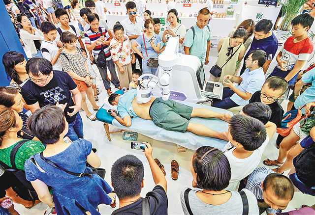 智博会重庆区县园区馆,EMMA人工智能按摩机器人正在为市民做腰部按摩。