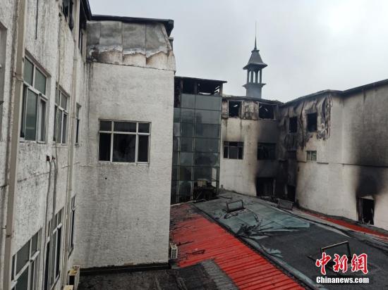 图为酒店外墙被熏黑。 解培华 摄