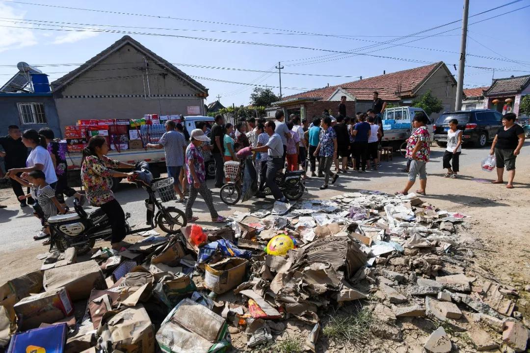 △8月26日,山东潍坊寿光,救援物资纷纷运到村里发放到村民手中。