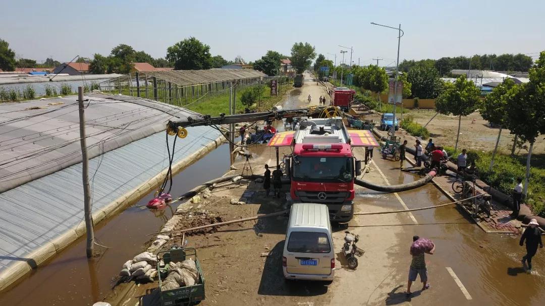 一方有难,八方支援。很多爱心企业和人士自发来到纪台镇捐献水泵和水带等物资。为了帮助受灾的大棚排水,山东从省内多地调集了12个消防支队的远距离供水车,全力排涝。