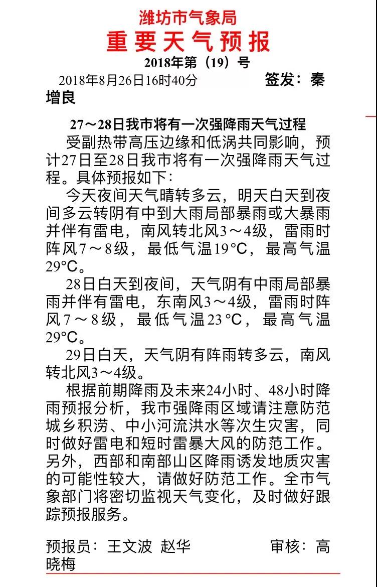 受副热带高压边缘和低涡共同影响,预计27日至28日潍坊市将有一次强降雨天气过程。具体预报如下: