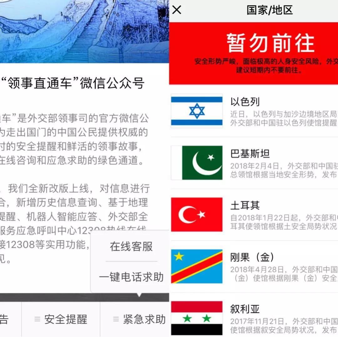 2017年起,公众可以关注微信号“领事直通车”实时咨询涉及领事协助的信息,查询各类有效安全提醒,紧急情况下还可以一键拨打12308热线求助。12308小程序也早就上线。