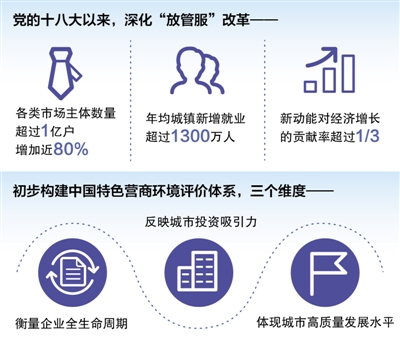 党的十八大以来,我国坚持深化“放管服”改革,各类市场主体数量超过1亿户、增加近80%,年均城镇新增就业超过1300万人,新动能对经济增长的贡献率超过1/3,经济结构呈现加快优化升级的良好态势。但与此同时,我国营商环境与高质量发展的要求和人民群众的期盼相比,还存在一定差距。