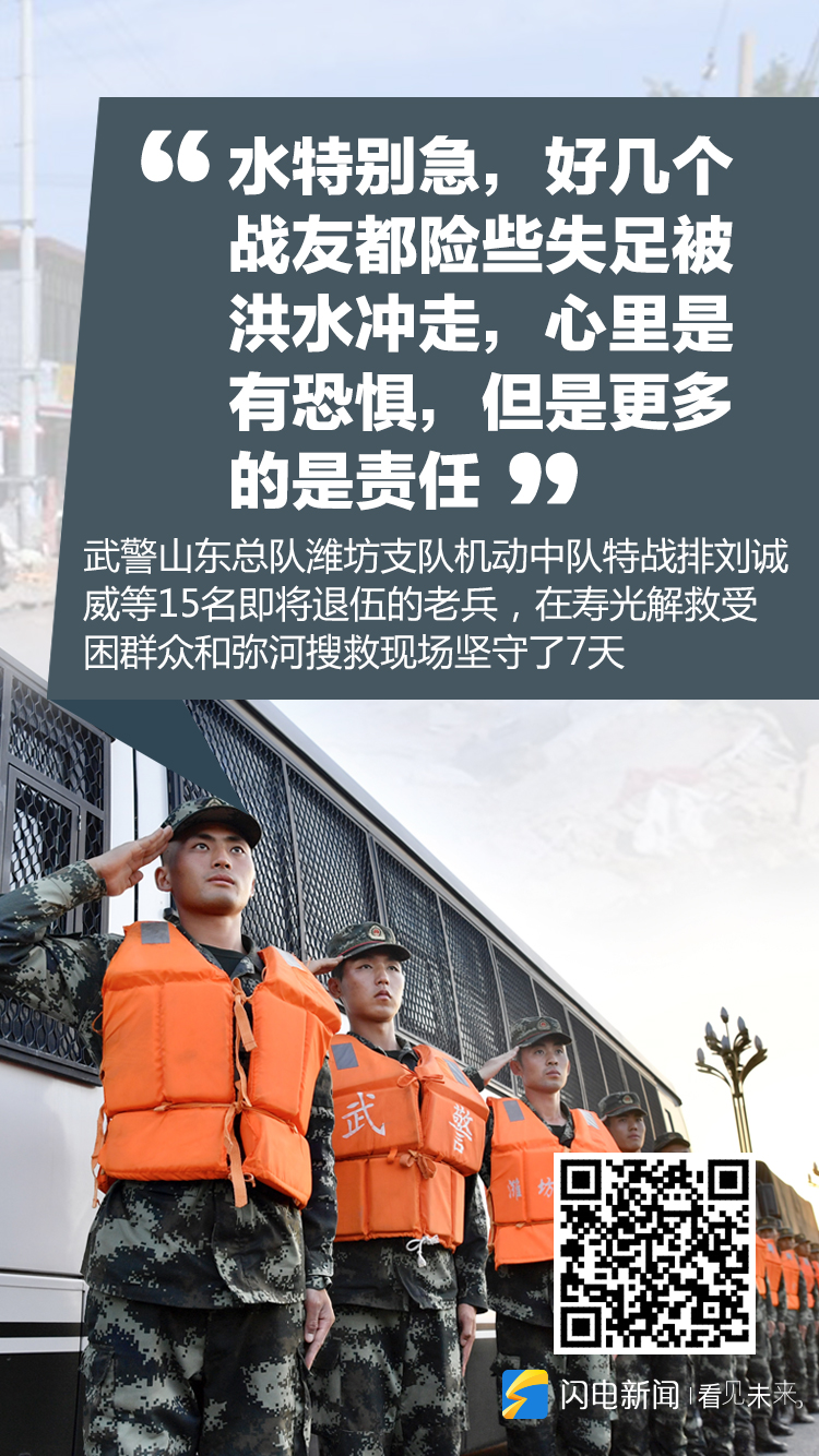 武警山东总队潍坊支队机动中队特战排刘诚威等15名即将退伍的老兵,在寿光解救受困群众和弥河搜救现场坚守了7天。