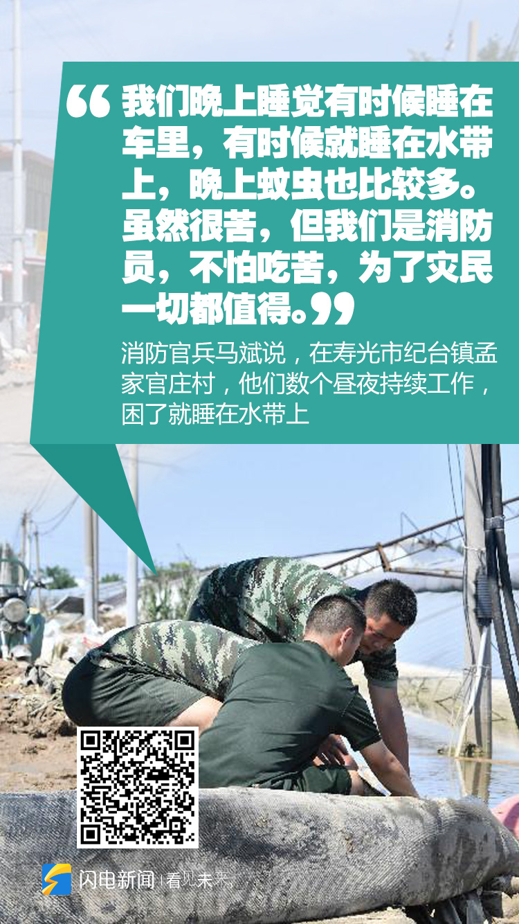 消防官兵马斌说,在寿光市纪台镇孟家官庄村,他们数个昼夜持续工作,困了就睡在水带上。