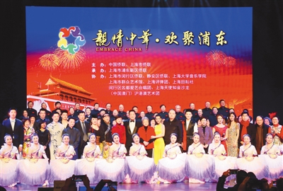 2017年2月11日,“亲情中华·欢聚浦东”慰问演出在上海上演。图为演出结束后,观众与演出团成员合影。