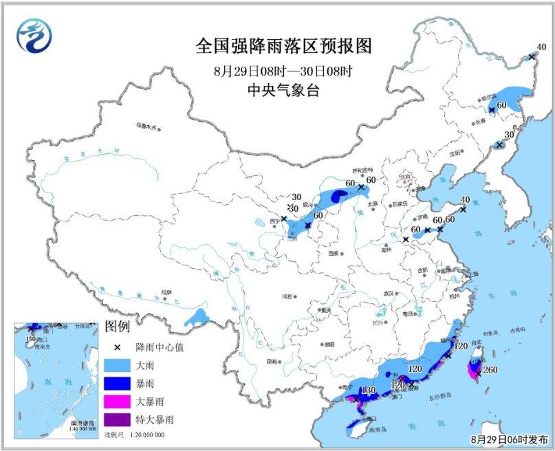 预计,8月29日08时至30日08时,黑龙江东部、吉林东南部、内蒙古西南部、宁夏北部、甘肃中西部、山东东部和南部、福建东部和南部、广东、广西东南部、海南岛北部、台湾岛中南部等地的部分地区有大到暴雨,局地大暴雨(100~130毫米),台湾岛南部局地有特大暴雨(250~260毫米);上述部分地区伴有短时强降水(小时雨量20~50毫米,最大可达70毫米以上),局地有雷暴大风等强对流天气。中央气象台8月29日06时继续发布暴雨蓝色预警(见图1)。