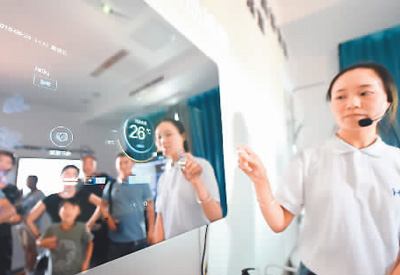 8月24日,智博会上,“智慧别墅”工作人员展示“智慧镜”的功能。 新华社记者 唐 奕摄