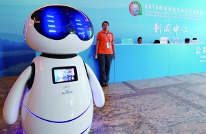 新闻中心现场设置了可提供咨询服务的智能机器人。 新华社发