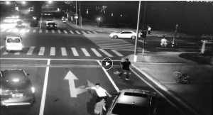 监控视频显示,27日21时36分,十字路口显示为直行红灯状态,一辆黑色轿车突然右转欲进入非机动车道,疑似与车道内一辆电动自行车发生碰撞。随后,宝马车后座一男子下车与电动自行车车主理论,车上一黑衣女子帮助将电动自行车移到人行道上。