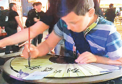 8月22日,玩家在腾讯展台提供的中国折扇上书写自己的中文名字。本报记者 彭训文摄