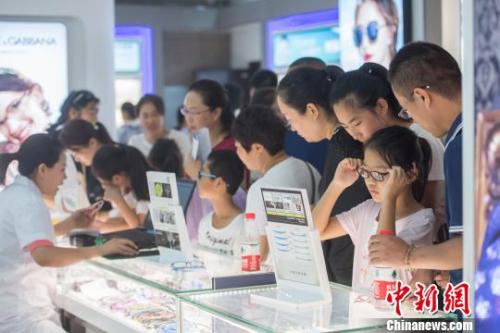 资料图:小学生们在柜台前挑选眼镜样式。韦亮 摄