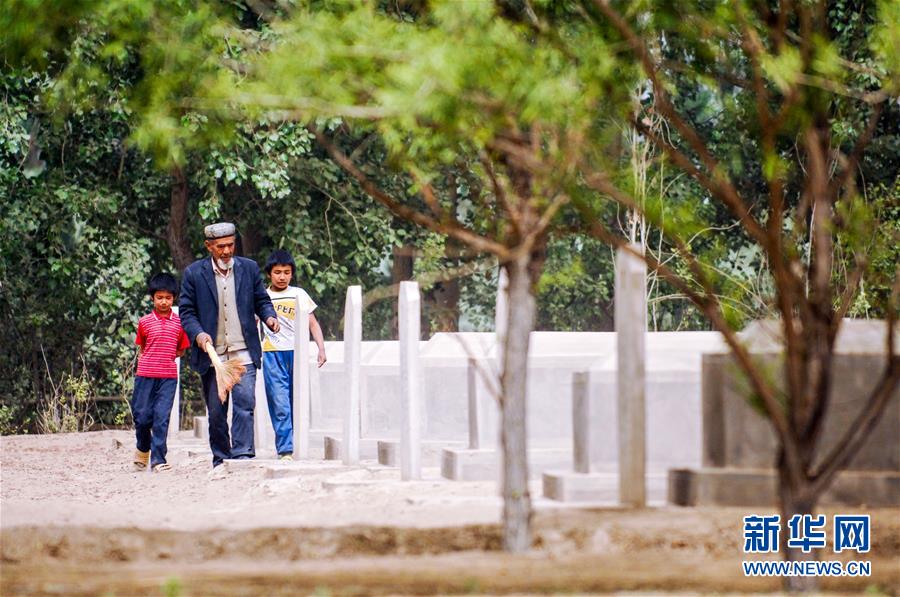 艾买尔·依提生前带着两个孙子在陵园扫墓(2011年4月30日摄)。 新华社记者 江文耀摄