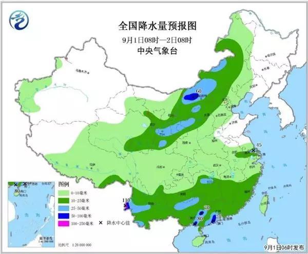 9月1日白天,广西东部和南部、广东中部和南部、福建东部、湖南东南部、湖北东部、安徽中部、江苏南部以及云南西部等地的部分地区出现大到暴雨,广西防城港和梧州、广东阳江等地大暴雨(100~236毫米,最大小时降雨量40~84毫米);另外,青海东北部、甘肃陇中、宁夏北部、内蒙古河套地区等地的部分地区出现大雨或暴雨。