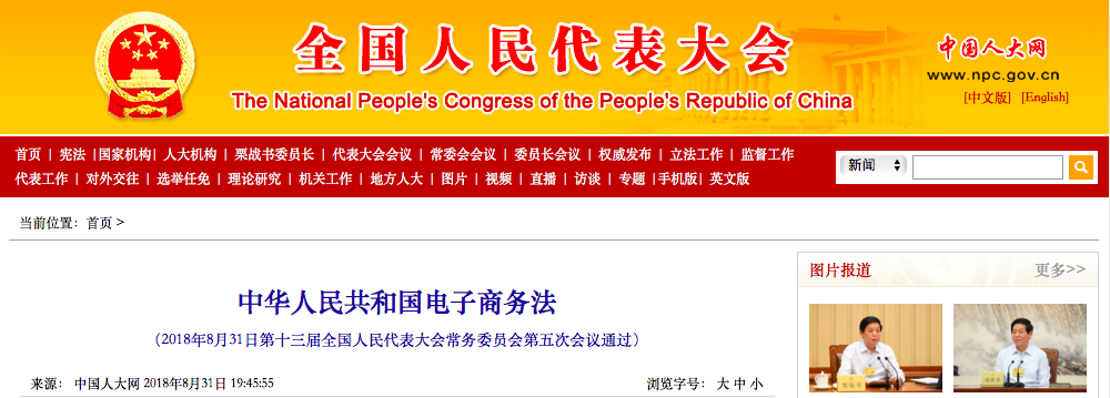▲中国人大网与2018年8月31日发布《中华人民共和国电子商务法》 来源:中国人大网