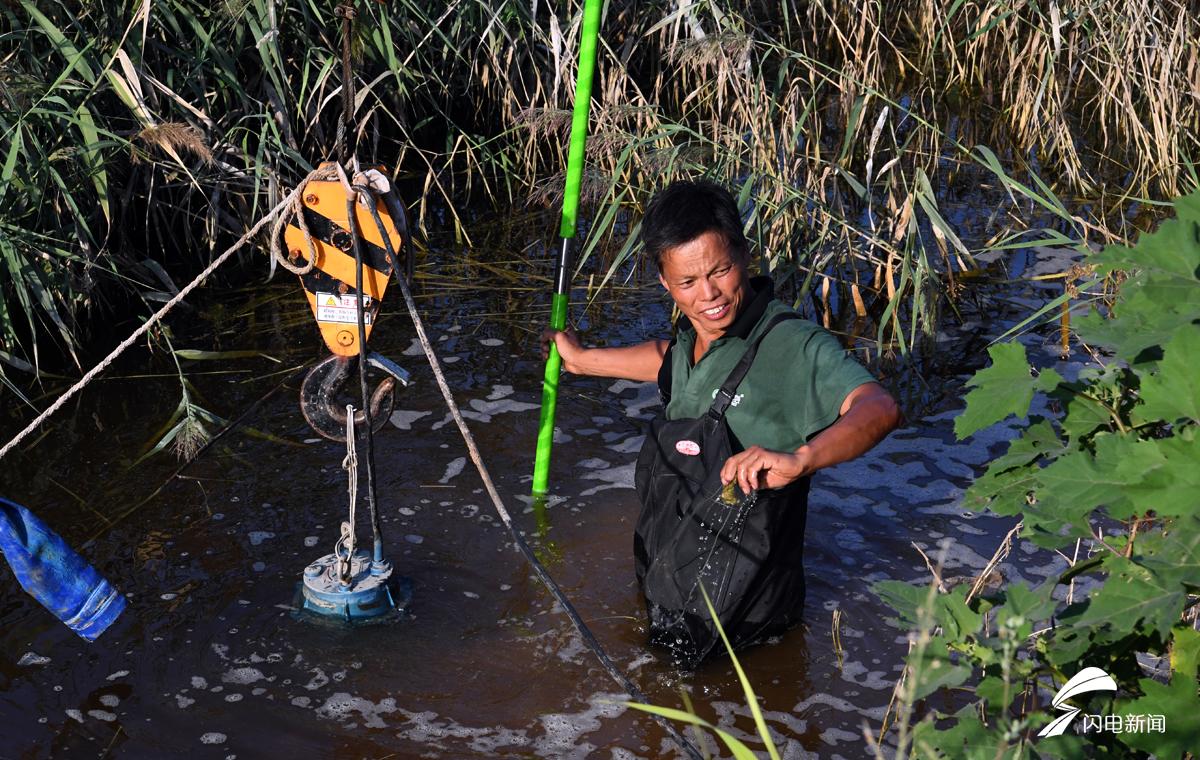 9月1日,宋家庄子村村民张志华正在清理蓄水池里的垃圾。齐鲁网记者 张伟 摄