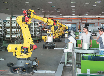 8月28日,在埃及苏伊士运河之畔的泰达工业园区,埃及工人在中国巨石埃及玻璃纤维股份有限公司(巨石埃及)生产车间内工作。