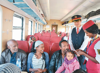 列车员在亚吉铁路一列列车上核实旅客车票。亚吉铁路(埃塞俄比亚至吉布提铁路)是世界上首条全产业链实施“中国标准”的跨国电气化铁路、非洲首条电气化铁路。