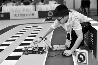 选手在参加第27届中国儿童青少年计算机表演赛无人驾驶对抗赛