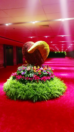 在国家会议中心四层大会堂迎宾区,“心形”握手花篮独具匠心引人注目。 北京晨报记者 张璐 文并摄