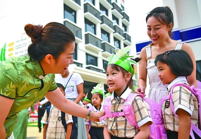 9月3日,在广西南宁市逸夫小学贤宾校区,老师在校门口迎接新同学。新华社记者 周华摄