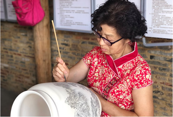 省级非物质文化遗产传承人袁宁霞在陶瓷坯体上描绘纹饰