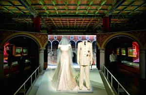 展览中还专门设置了一个单元,展示摩纳哥王室的服饰、饰品以及茶具等生活用品。其中王室成员在婚礼上的礼服格外抢眼。比如乔治·阿玛尼为夏莱娜王妃设计的婚纱(如图)。略掺黄灰色的白色公主缎和真丝蝉翼纱,镶嵌镀金珍珠,配以施华洛世奇的水晶和点状珍珠贝刺绣的花枝图案。真丝薄纱和白金绣线制作的面纱,拖裙长5米,可以在穿过亲王宫广场的红地毯上铺展开来。阿尔贝二世亲王教堂婚典上穿着的制服,由王宫御用裁缝让·克洛德·欧施班迪制作,佩戴着圣查理骑士团、格里马尔迪家族和荣誉军团的大十字勋章。