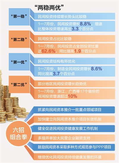 “第一优”是民间投资结构有所优化。制造业是民间投资的重点领域,民间投资在该领域的占比超过了80%。1—7月份,制造业民间投资增长8.6%,增速比去年同期提高3.7个百分点,比近两年的低位提高6.5个百分点。其中,专用设备制造业、通信和电子设备制造业投资分别增长14.8%、19%,远高于有色金属冶炼等传统产业增速。