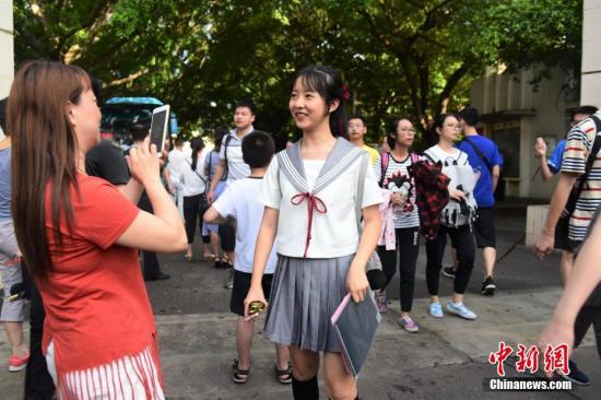 资料图:一名家长为走出考场的孩子拍照。 王以照 摄