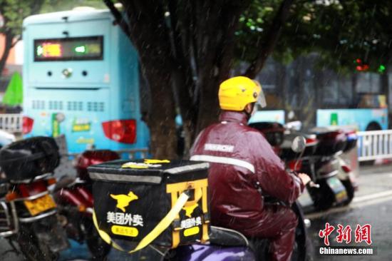 9月7日中午,暴雨袭击柳州,外卖小哥雨中出行。 朱柳融 摄