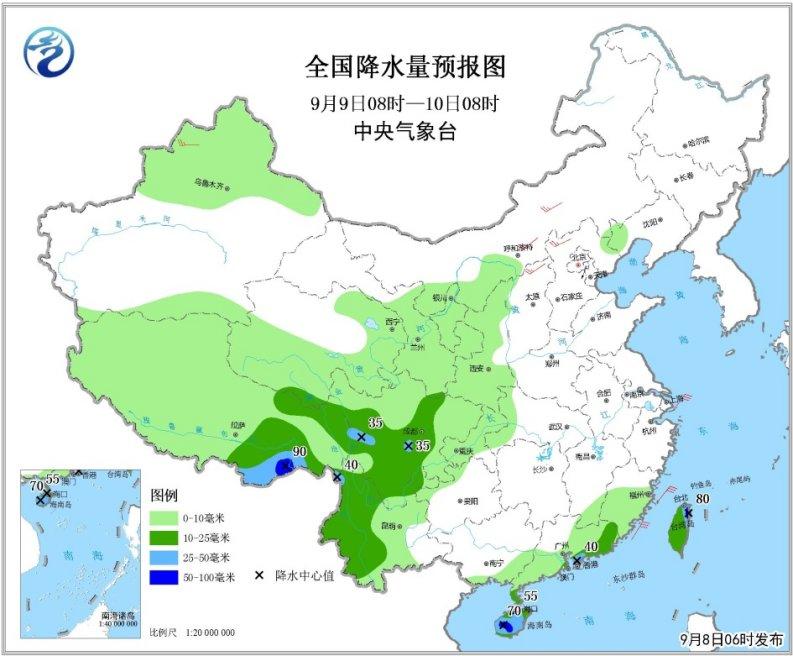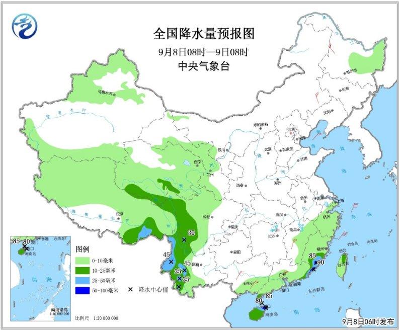 9月8日08时至9日08时,江南东部、华南中东部和南部、西南地区中西部、西北地区中部、青藏高原大部、新疆西北部和台湾岛等地的部分地区有小到中雨;其中,福建东南部、广东东部、云南西北部和海南岛东北部的部分地区有大雨或暴雨(50~90毫米),上述部分地区伴有短时强降水等强对流天气。内蒙古中东部、山东半岛东部、江南中西部、华南北部等地的部分地区有4~6级风,台湾海峡部分海域风力可达8级、阵风9级(见图1)。