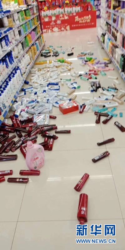 墨江县一超市商品从货架上掉落(9月8日摄)。