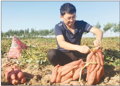 图为日前在西小王镇高王村的优质红薯基地,伍思商城的电商业主常乐正在进行实地验货。