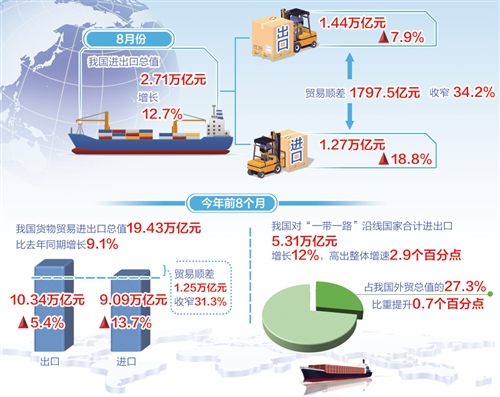 今年前8个月,我国货物贸易进出口总值19.43万亿元,同比增长9.1%。其中,出口10.34万亿元,增长5.4%;进口9.09万亿元,增长13.7%;贸易顺差1.25万亿元,收窄31.3%。