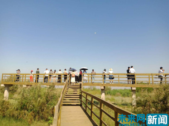 采访团记者们登上瞭望塔拍摄保护区内的鸟儿。 未来网记者 刘文静 摄