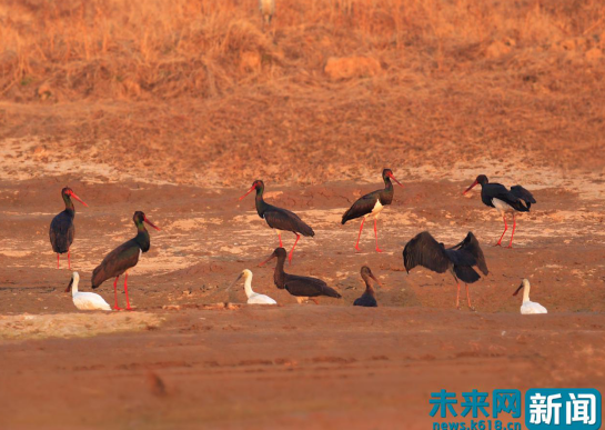 河南省孟津县黄河湿地国家级自然保护区内的黑鹳(黄河湿地孟津管理局供图)