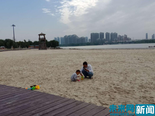 一位年轻的妈妈带着孩子在沙滩上玩耍。未来网记者 刘文静 摄