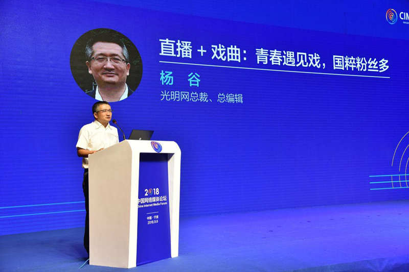 央视网消息(记者张晓琳 袁育堃 刘春妍)9月6日,2018中国网络媒体论坛在宁波举行。在6日下午的《传媒+:跨界融合推动产业升级》分论坛上,光明网总裁、总编辑杨谷发表了题为《直播+戏曲:青春遇见戏,国粹粉丝多》的主题演讲。
