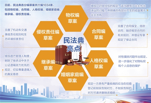 目前,民法典各分编草案共六编1034条,包括物权编、合同编、人格权编、婚姻家庭编、继承编、侵权责任编,其中的亮点值得关注。
